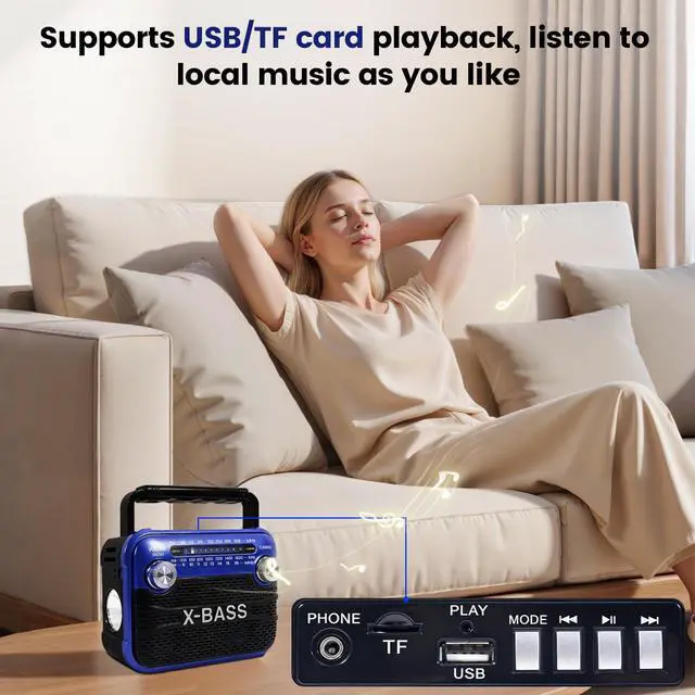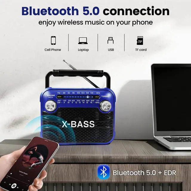 Superior AM/FM/SW Radio ReceptionThis premium shortwave radio delivers exceptional clarity with its antenna for strong FM( 87.5 -108 MHz)AM(520-1620KHz) SW(9-16MHz) signals. Whether at home or outdoors, your shortwave radio ensures perfect reception for news, weather and music ^^ Multi-Function Radio with Bluetooth Playback Connect your Bluetooth - enabled devices, like smartphones, tablets, or laptops, via Bluetooth 5.0 + EDR for seamless wireless audio streaming. If you prefer local media, simply insert a USB drive or TF card (up to 16GB supported). Enjoy your favorite playlists and online content with ease, anytime and anywhere.