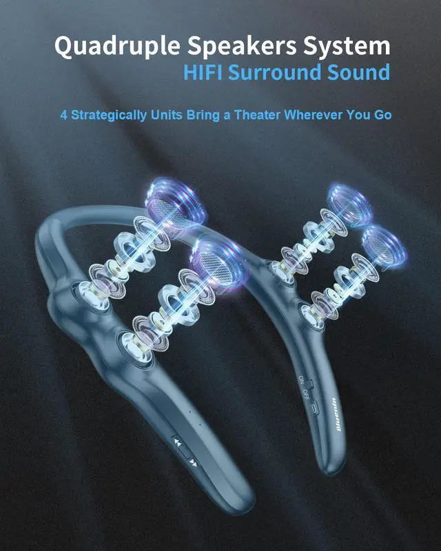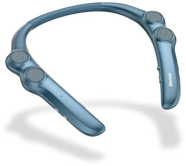 Stay comfortable for listening all day. ^^ Immersive 3D Surround Sound ExperienceThe lightest weight neck speaker featured with 4 strategically placed speaker units, it delivers immersive 360-degree surround sound, placing you at the center of the action with dimensional, lifelike sound. These strategically positioned speaker units create a concert-like ambiance wherever you go. ^^ Soft TPU Rubber Neckband & Fashion Metal Mesh Design The soft TPU rubber shapestay neckband features a material that naturally fits around the neck. And the speaker uses a fashionable metal mesh design, whether it is business meeting work.