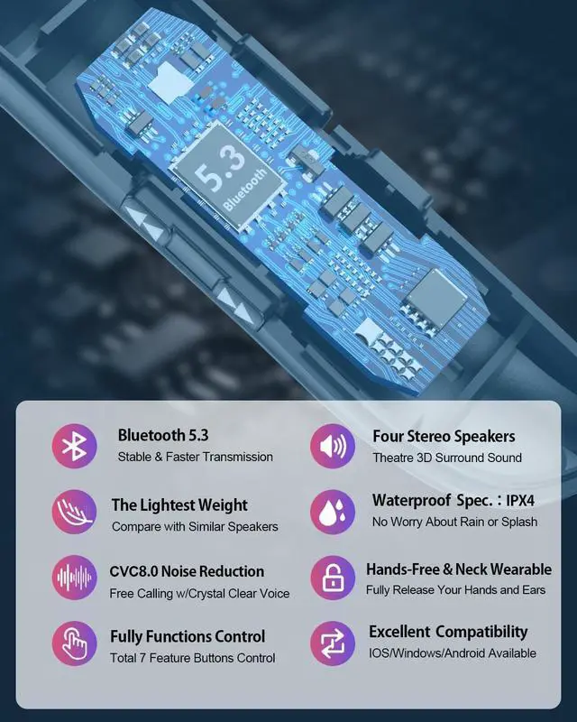 New Release Neckband Speaker w/ Latest Bluetooth 5.3 Technology The new upgrated speaker adopts the latest bluetooth 5.3 technology, consuming less power than bluetooth 5.0 while achieving a more stable connection and faster communication, no signal loss or music interruption. With multi-point support, connect two devices simultaneously. Transmission is stable up to 33 feet (10 meters), and it's compatible with all bluetooth-enabled devicesdelivering lossless HD sound. ^^ Ergonomic Shapestay Design & Lightest Weight at 90gThe new neckband bluetooth Speaker is based on ergonomic shapestay design, once you put this wearable speaker around your neck, youll hardly know youre wearing it, weighing only 90g, and youll never feel a burden by leaning lightly on the shoulder.
