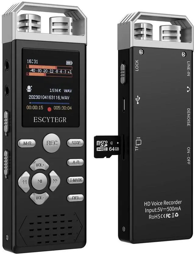 Ample Storage Capacity The ESCYTEGR digital voice recorder boasts a substantial 80GB of storage space. With 16GB of built-in internal memory and an additional 64GB external TF card pre-installed, you can store an impressive 5800 hours of audio files (at 32kbps) or 15000 songs. Plus, it doubles as a USB flash disk for added convenience. ^^ Smart Voice Activation & Exceptional Microphones The ESCYTEGR digital voice recorder features voice-activated recording, kicking in when it detects sound (above 30 dB) and pausing when ambient noise falls below 30 dB. This nifty feature optimizes memory and conserves power.