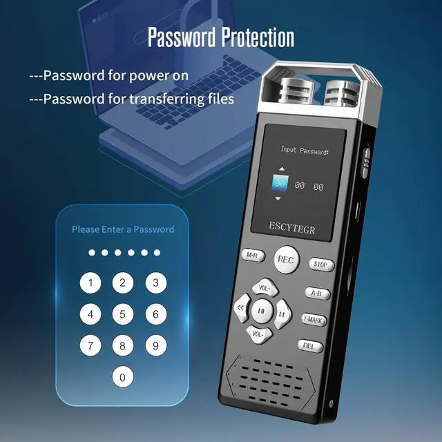 Moreover, it's equipped with an auto-save feature to secure your recordings before the battery depletes. ^^ Security and User-Friendly The ESCYTEGR digital voice recorder provides dual modes of password protection, ensuring the utmost security, whether at startup or data transfer. Its ergonomic design makes operation a breeze. A-B repeat and T-MARK functions are easily accessible. Additionally, it features a built-in speaker for quick playback and doubles as an MP3 player ^^ Versatile & Unbeatable Value The ESCYTEGR voice recorder is a multi-functional powerhouse, featuring voice operated recording Recording monitor Timer recording Line-in T-MAKR Automatic noise reduction Automatic gain control Recording divide Recording timestamp A-B repeat /Cyclic playback Standard 3.5 mm earphone Built-in speaker As MP3 player Variable speed playback Password protection File transfer ^^ Ideal Gift & Satisfaction Guaranteed Perfect for lectures, classes, meetings, interviews, and more, it's not just a recorder; it's a thoughtful gift for family, relatives, and friends.
