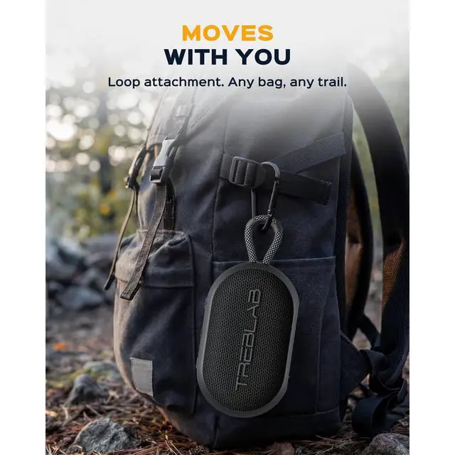 Playtime: Travel Speaker with Long Battery Life & USB-C Charging. Fully recharges in 2 hours via USB-C, making this travel speaker perfect for work, travel, or outdoor fun. ^^ Rugged, Compact, Durable: Weighing only 0.45 lbs, this backpack speaker has a rugged ABS + fabric build and a loop for easy attachment. The perfect Backpack speaker for office & outdoors. ^^ Bike Speaker with