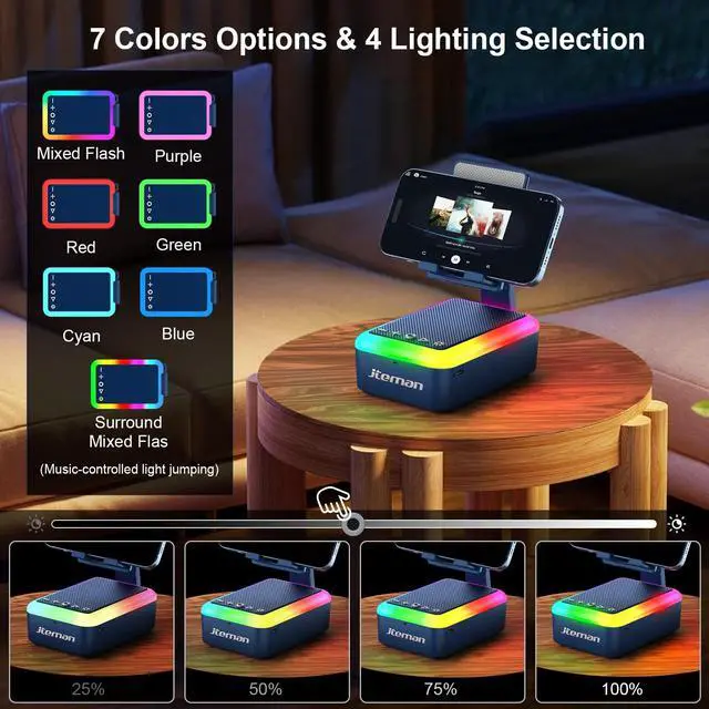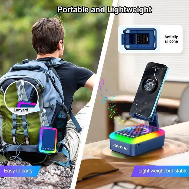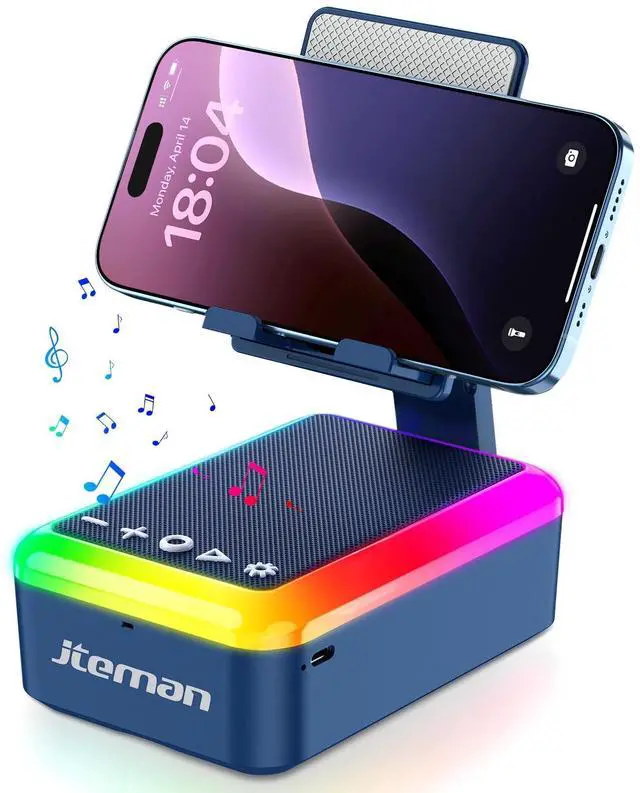 Big Stereo SoundOur phone stand with speaker is loud and clear, built-in 45W Power Speaker, provide HD stereo surround sound, allowing you to fully enjoy the pleasure of music. Upgraded Bluetooth 5.3, without any delay. The cool gadget is a great gift for women men. ^^ Bluetooth Speaker with LightOur multifunctional Bluetooth speakers with light has 7 colors options, the rhythmic mode can be danced to the beat of the music. 4 kinds of brightness can be adjusted. Turn on the lights while enjoying the music, it's a real party atmosphere!