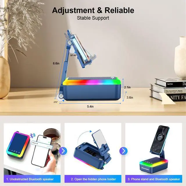 PS: LONG PRESSING THE FIFTH BUTTON 3 SECONDS TO TURN OFF THE LIGHT ^^ Adjustment & ReliableThe angle and height of the phone stand can be adjusted to the most comfortable viewing angle. Anti-slip silicone design, stability and strong support, not easy to move. To avoid the phone falling or phone stand speaker tilting, please do not pull the viewing angle over 90 degrees. ^^ Portable and LightweightOur portable Bluetooth speakers with foldable design, compact and easy to carry. The detachable lanyard makes it easy to hang on your hand or your bag. Lightweight but stable, it doesn't move easily even when playing loud music. Perfect for use at home, in the office, travel, indoor and outdoor. ^^ Universal CompatibilityThe cell phone stand supports for most 4-13" smartphones, tablets, e-readers, Switch, iPad and more. The wireless Bluetooth speaker compatible with iPhone, Samsung, Android smartphones, Computer, and any device with Bluetooth. ^^ Cool Gadgets for Women MenIt's a great birthday gifts for men women father, mother, wife, husband, friends and anyone you love.