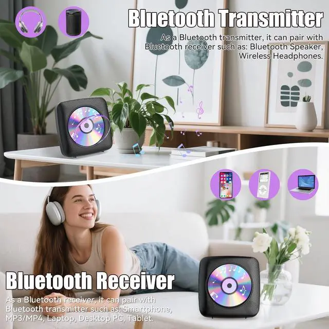 • Bluetooth Transmitter & Receiver: Equipped with Bluetooth 5.0, this CD player can connect to Bluetooth-enabled devices like mobile phones or tablets when used as a Bluetooth Hi-Fi speaker. Also connects to Bluetooth-enabled headphones, providing a 33-foot connectivity area. This dual-mode functionality allows you to enjoy your favorite music wirelessly, whether you're streaming from your phone or listening through high-quality Bluetooth headphones