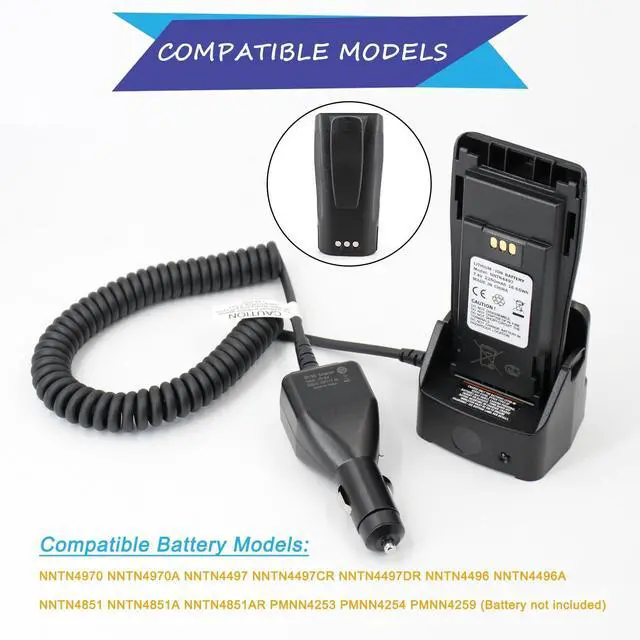 Battery Models: NNTN4970 NNTN4970A NNTN4497 NNTN4497CR NNTN4497DR NNTN4496 NNTN4496A NNTN4496AR NNTN4851 NNTN4851A NNTN4851AR PMNN4253 PMNN4254 PMNN4259Compatible Radio Models: CP040 CP140 CP150 CP160 CP180 CP200 CP200D CP200XLS CP250 CP340 CP360 CP380PR400 EP450 DEP450 DP1400 GP3688D GP3688 GP3188 XIR P3688Motorola R2Key Features: Compatible with all Ni-CD, Ni-MH and Li-ion Batteries. This charger is a plug-and-play solution that allows the radio to be used while charging. The charger uses a microprocessor for charge control and override protection, ensuring safe and efficient charging. The travel car charger includes a front LED indicator to display charging status(Red for charging, Green for fully charged, and Blinking Red for faults). The vehicular charger base with the removable battery locating rail which suitable for standard (slim) batteries (nntn4851 nntn4970) or thick batteries (nntn4497).