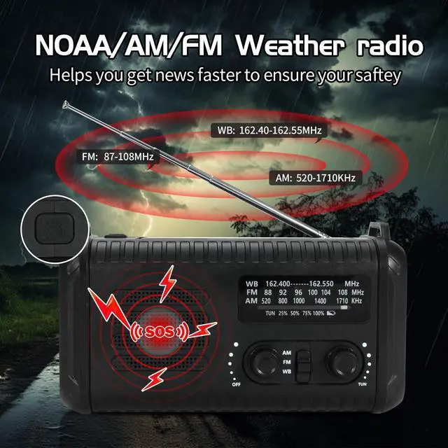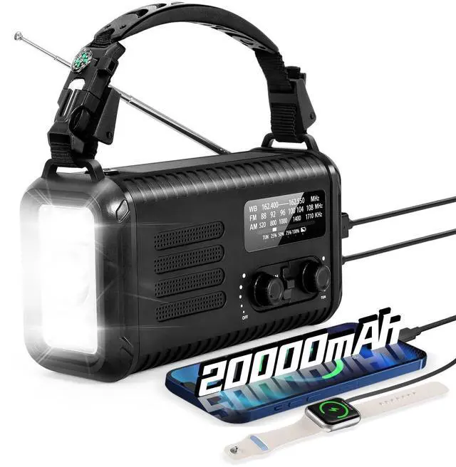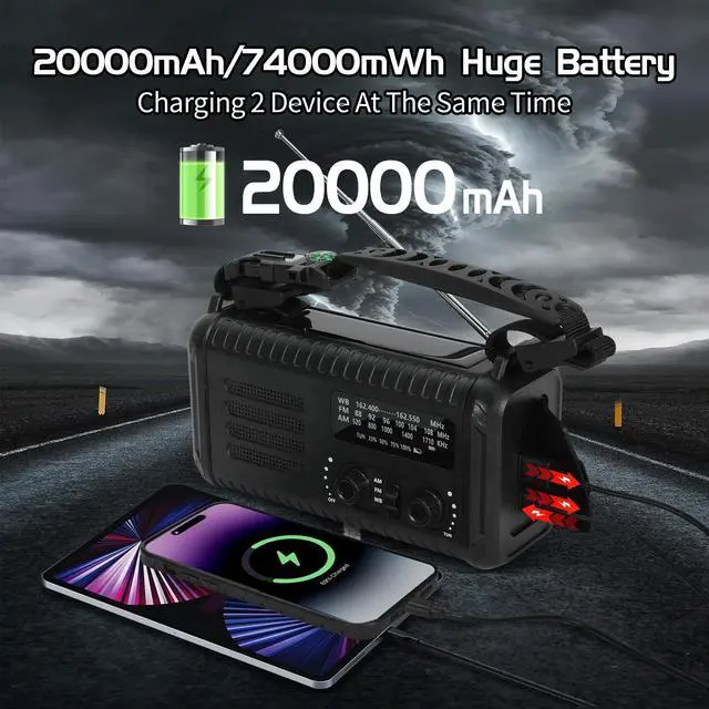 20000mAh LARGE BATTERY-Our radio Equipped with a powerful 20000mAh (74000mWh) rechargeable battery, Very efficient in both charging and discharging. When we are trapped in trouble, this emergency hand crank radio with a 20000mAh big power battery may be our life-saving tool. It supports charging 2 devices at the same time. It can also be used as a backup power charger at ordinary times ^^ AM FM NOAA Emergency Weather Survival Radio-Equipped with an advanced DSP chip, this emergency radio reliably receives critical weather and hazard alerts from 7 NOAA channels. Be prepared for unpredictable weather events like hurricanes and winter storms.