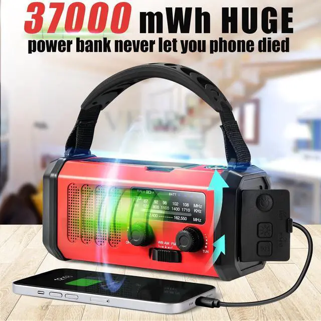 Emergency radio-The emergency weather radio can receive NOAA /AM/FM signal. When you in emergency, turn it on that it provide the weather important information for you needs. You can get the latest emergency weather news and information for outside. Weather radio is you frist choise. Let you no longer lose outside information in dangerous weather. Pertect you and your family in dangerous. Great for tornadoes, tsunamis, Wildfire, hurricane & snowstorm. ^^ Huge power backup-The battery operated radio have 10000mAh which is super huge emergency power. It would not never let your phone power off.