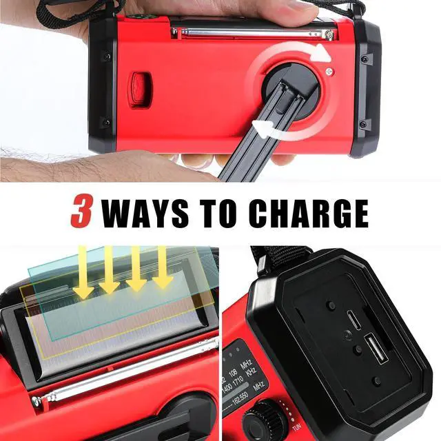 10000 mAh polymer battery could provide enough emergency power for important contacting assistance in emergency. ^^ Portable Radio and SOS alarm-The NOAA weather radio has a nylon strap for carry. The rechargeable weather radio is practical and portable and comes with SOS alarm function. The radio also have a compass which is on top of the radio. Its very helpful to identify the direction when you are hiking, camping or any other outdoor sports. For hiking or trekking purpose this type of radio is a smart choice. ^^ Three ways to charge-The AM/FM/WB radio has 3 rechargeable ways includes Type-C charge(USB-C input), solar charge and hand crank.