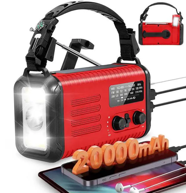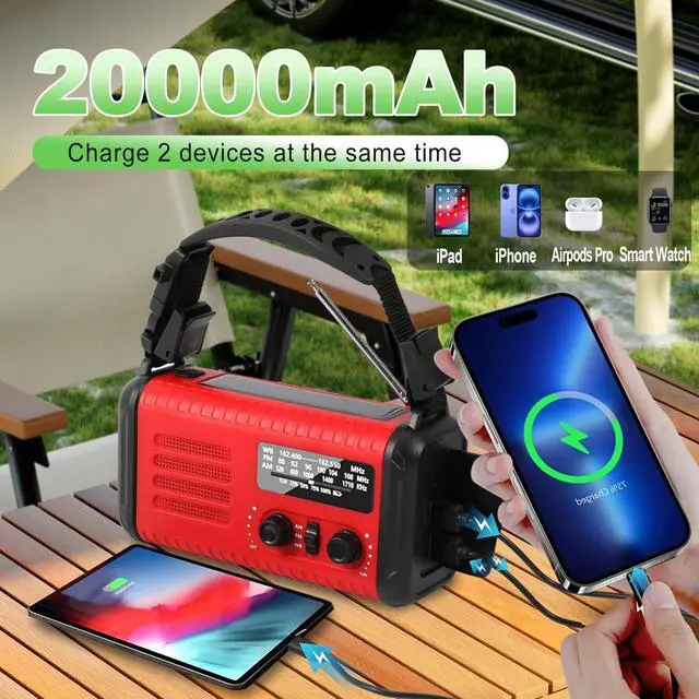 ^^ SUPER BRIGHT FLASHLIGHT & READING LAMP The 4modes flashlight on this emergency hand crank radio has been upgraded to 5W light that provides 250LM of brightness, enough to provide you with emergency lighting in the event of a power outage. also come with wide range Reading lamp, greater applicability. In fully charged state, flashlight and reading each last over 100 hours. ^^ MULTI-USE & DURABLEThe powerful weather emergency radio size 6.933. 943 inches has 3 charging options, with a 20000mAh rechargeable battery that can be charged via USB cable, solar panel or hand crank.