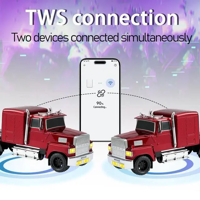 Vintage Truck Design A truck Bluetooth speaker designed like a retro American semi-truck, complete with movable wheels and chrome details. Perfect for car lovers, collectors, and as unique retro gifts. ^^ Powerful HD Sound & TWS Enjoy crystal-clear stereo audio with dual speakers and bass enhancement. Pair two car Bluetooth speakers together via TWS (True Wireless Stereo) for a cinematic surround-sound experience. ^^ LED Lights & FM Radio Built-in LED headlights and ambient glow create the ultimate vibe for parties, camping, or relaxing at home. Switch to FM radio for nonstop entertainment beyond Bluetooth playback.