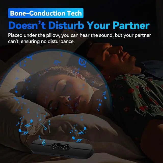 PRIVATE BONE CONDUCTION SPEAKER NO DISTURBANCE TO PARTNER Utilizing advanced bone conduction technology, sound is transmitted through pillow vibrations, so only you can hear it while resting your head, without disturbing your partner. ^^ UNDER PILLOW SPEAKERS FOR SLEEPING WITH SIDE-SLEEPING COMFORT Wearing earbuds while side-sleeping can be uncomfortable, and traditional speakers may disrupt your partner. This specially designed pillow speaker ensures comfort whether you sleep on your back or side. ^^ SLEEP AID PILLOW SPEAKER Place the sleep speaker under your pillow to play built-in white noise, audio from a TF card, or audiobooks content from your phone, helping you fall asleep faster.