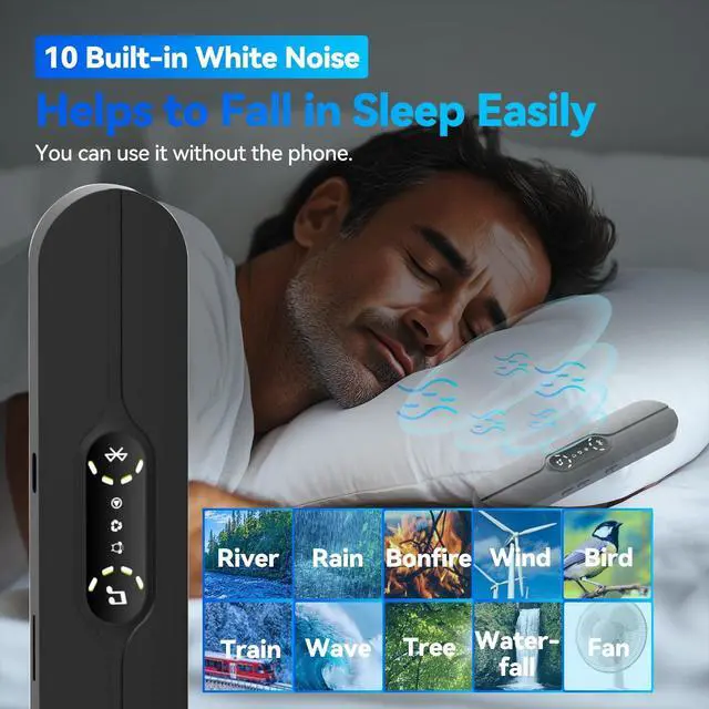 ^^ 10 BUILT-IN SOOTHING WHITE NOISE OPTIONS Equipped with 10 white noise sounds, including flowing water, rain, campfire, wind, birdsong, and trains, this white noise speaker can be used without connecting to other devices or the internet. ^^ 3 AUTO-OFF TIMER FUNCTION TO SAVE ENERGY Set the playback duration for 30 minutes, 1 hour, or 2 hours to save battery life. After the set time, the under pillow speakers for sleeping automatically turns off. On average, the battery lasts up to 8 hours. ^^ DISPLAY SCREEN Features a display screen that shows battery status, connection type, white noise selection, and playback status, giving you clear and easy access to more information.