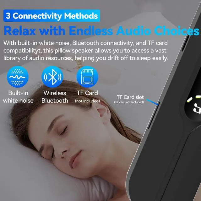 PS: Memory card is not included. ^^ COMPACT AND TRAVEL-FRIENDLY DESIGN Weighing just 2 ounces and measuring 5.9 inches at its longest side, its slightly longer than an iPhone, easily fitting into your backpack, handbag, or pocket, making this under pillow speaker ideal for travel and helping you sleep in unfamiliar environments. ^^ RELAXATION MUSIC SPEAKER FOR ORDINARY USE Combining bone conduction and traditional audio technology, this pillow speaker isnt just for sleep. This sleep bar can also function as a regular speaker for playing music at higher volumes. ^^ USER MANUAL INCLUDED For detailed instructions on how to switch between functions and use the bed bluetooth pillow speaker for sleeping, please refer to the included user manual.