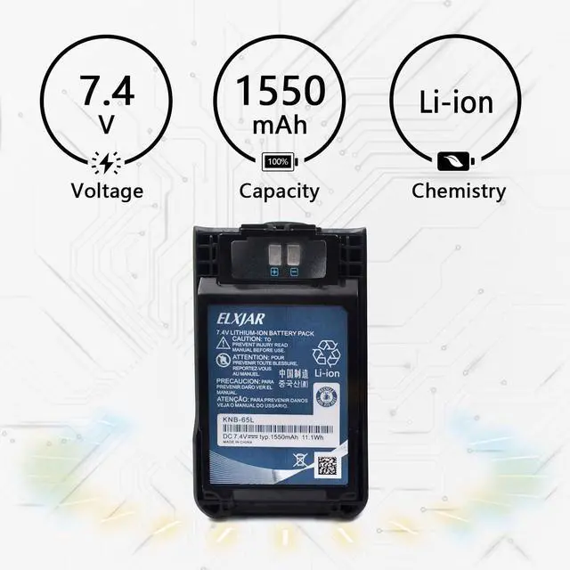HIGH CAPACITY LI-ION PERFORMANCE AND POWER SPECS: Utilizes high-performance Lithium-ion (Li-ion) rechargeable chemistry, providing a stable 7.4V nominal voltage and an impressive 1550mAh capacity, yielding approximately 11.47 Watt-hours of energy output. This enhanced capacity guarantees significantly extended runtime, ensuring your Kenwood radios remain active and reliable throughout long work shifts and continuous use. ^^ EXTENSIVE KENWOOD RADIO AND CHARGER COMPATIBILITY: This pack is a dedicated, high-quality replacement fully compatible with key Kenwood models including TH-K20, TH-K40, TK-2000, TK-3000, TK-3501, and TK-U100. It serves as a direct replacement for battery Part Numbers KNB-63L and KNB-65L and is engineered for seamless operation with the original KSC-43 desktop charger. ^^ RELIABLE LI-ION TECHNOLOGY AND STABLE OUTPUT: Built with advanced lithium-ion cells, the battery ensures highly stable and efficient energy output, crucial for maintaining consistent radio transmission power and audio clarity. The Li-ion chemistry supports hundreds of charging cycles, offering long-term reliability and minimal capacity degradation over the life of the battery. ^^