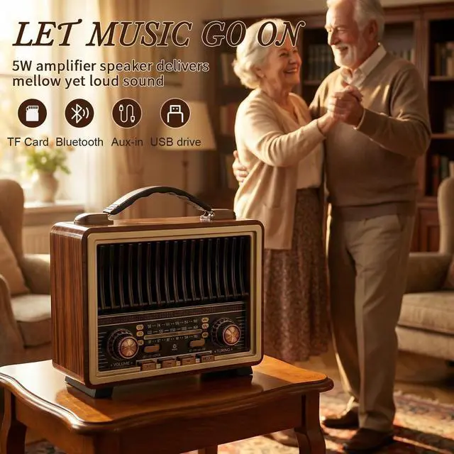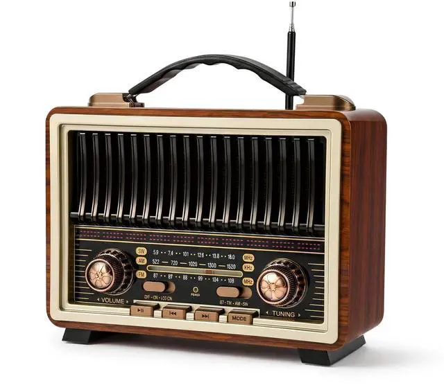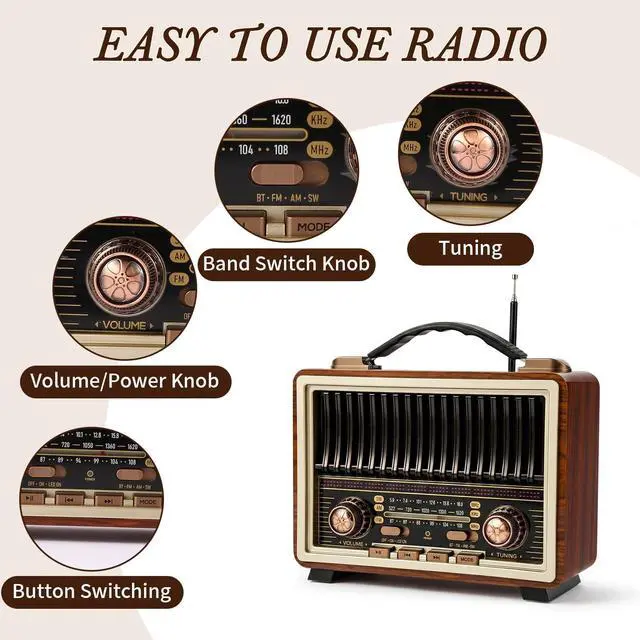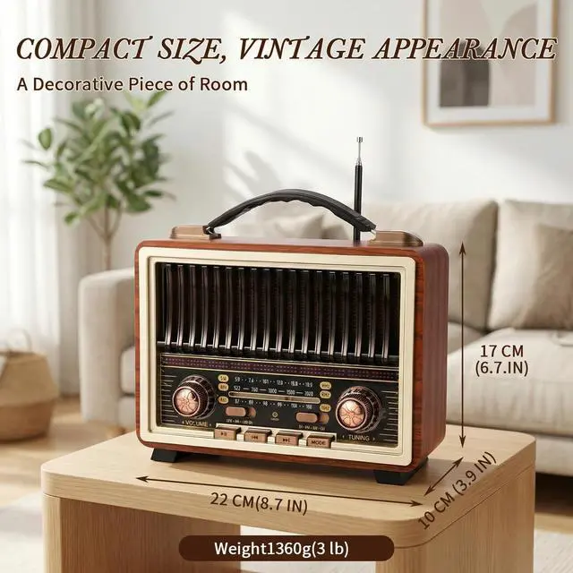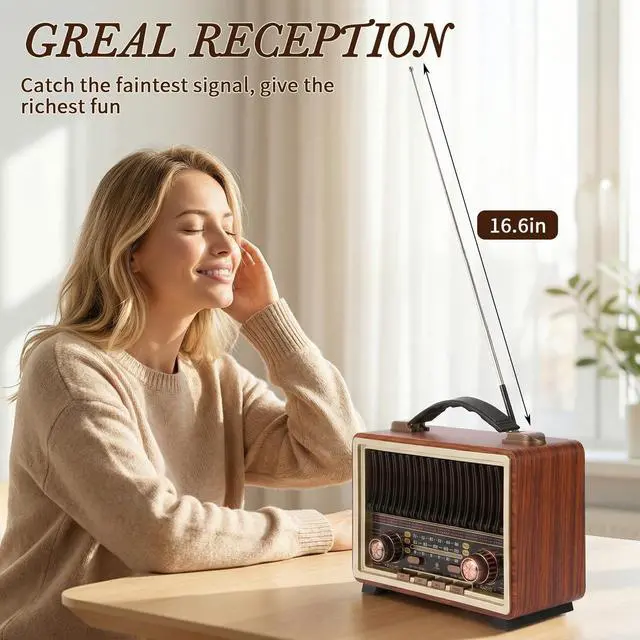 Radio With Excellent ReceptinoThe Radio Portable AM FM Equipped with powerful DSP chip and 50cm long retractable antenna, tuning vintage radio has excellent signal quality to pick up enough stations.paired with a clear graduated dial and metal knob, showcases quality i