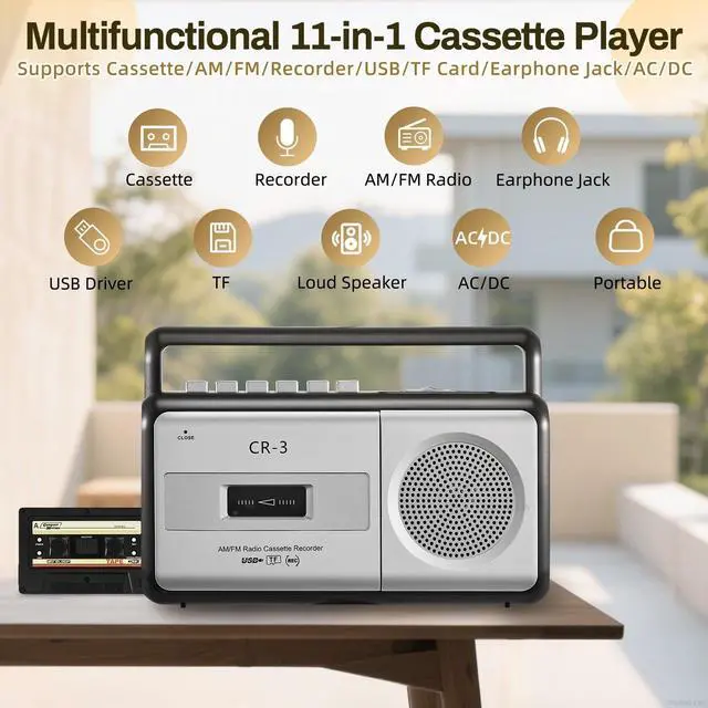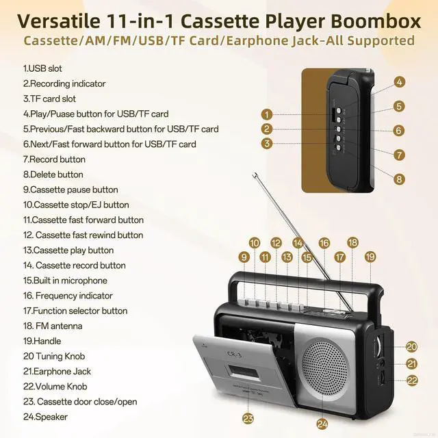 Multifunctional Cassette Player: This cassette player supports AM/FM radio, USB, and TF card playback, and includes a headphone jack to meet various audio needs. Easily play MP3 files from USB drives or TF cards (up to 32GB). With its elegant design and intuitive controls, its perfect for music lovers who appreciate classic aestheticsplay your old mixtapes and relive the golden memories of the past ^^