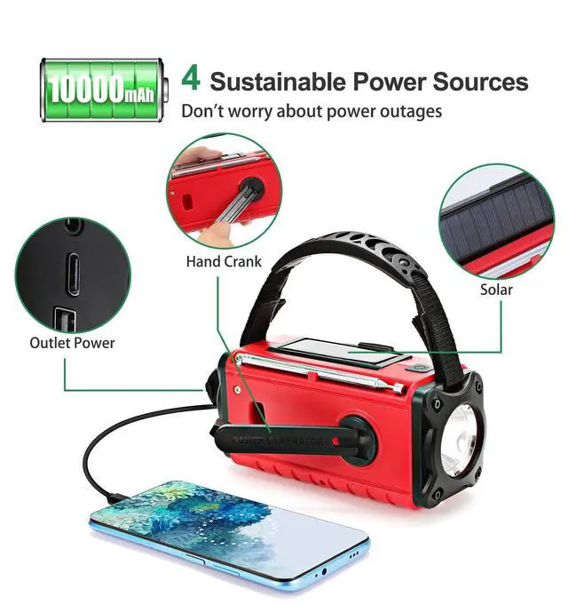 3.5 mm headphone jack for your enjoying radio shows privately. ^^ 10, 000 mAh BatteryLeaton emergency radio is equipped with a 10, 000 mAh battery, which allows you to listen to the radio without worrying about the battery life, you even listen to the radio for three days without charging without any problem! It can also charge your cell phone, its built-in 10000 mAh high-capacity battery is even better than most of the rechargeable batteries on ^^ 4 Power Sources-Long Runtime This solar radio, Necessary for emergencies - built-in rechargeable battery with 10000MAh for charging the mobile phone and tablet in an emergency, This emergency weather crank radio can reliably receive the latest emergency weather forecasts of NOAA and AM/FM radio stations, Emergency portable radio, a super bright torch, a reading lamp, SOS alarm, a hand crank and a solar panel for charging the battery.