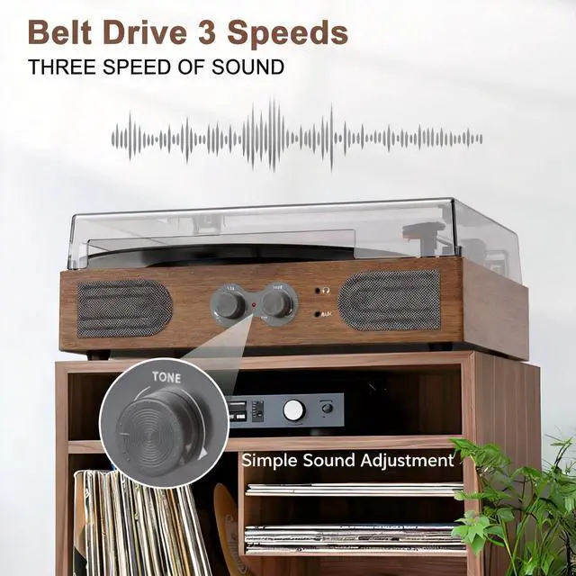 Balanced Sound for Everyday Listening Built-in dual stereo speakers with Bluetooth wireless input transmission let you enjoy your smartphone music in style and comfort. Play music directly through AUX or listen privately with headphones. Dual speakers for you can play records without external speakers. ^^ Designed for Easy, Natural UseSupports three speeds (33 1/3, 45, and 78 RPM) to play all your favorite 7", 10", and 12" vinyl records. This turntable is equipped with a belt-driven anti-vibration system, a combination of spring and belt design that effectively reduces vibration and enhances sound quality, no skipping.