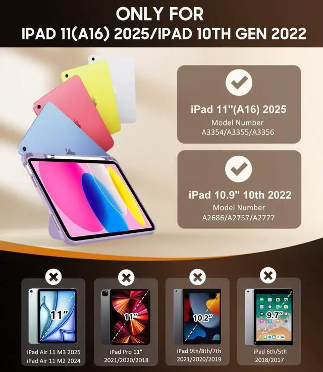 • Compatibility: Designed for iPad (A16) 11th Generation 11inch 2025/ iPad 10th Generarion 10.9inch 2022 (Model: A3354/A3355/A3356/A2696/A2757/A2777); NOT COMPATIBLE WITH ANY OTHER MODELS; please verify your iPad's model number on the back before purchasing