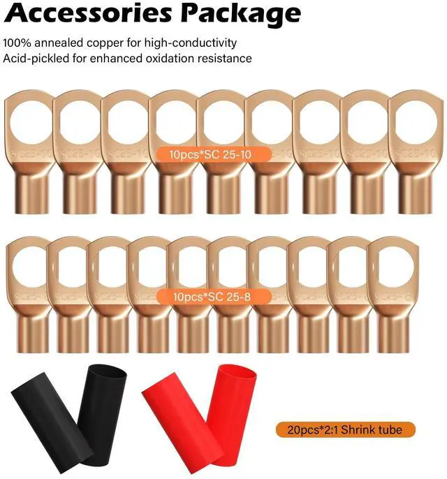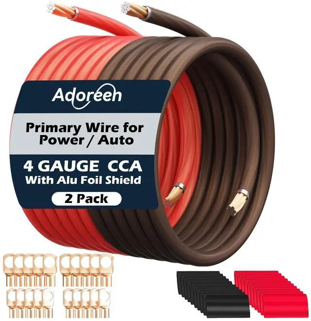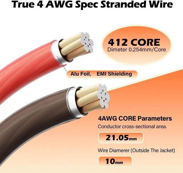 accessories: 20 high-quality copper terminals, 20 heat shrink tubes (10 black and 10 red, OD 10.00 mm, length 5CM) ---- Aluminum foil shielding effectively resists electromagnetic interference, superior to common unshielded cables, resulting in purer sound quality ---- Made of high-quality 4 AWG copper-clad aluminum (CCA, 30% copper), ensuring stable power transmission; CCA is lightweight and flexible, ideal for high-efficiency power needs ---- Red and black color design allows quick identification and correct wiring, preventing equipment damage ---- True 4 AWG gauge, OD 8.5 mm, more reliable for demanding uses like car audio or high-current batteries ^^
