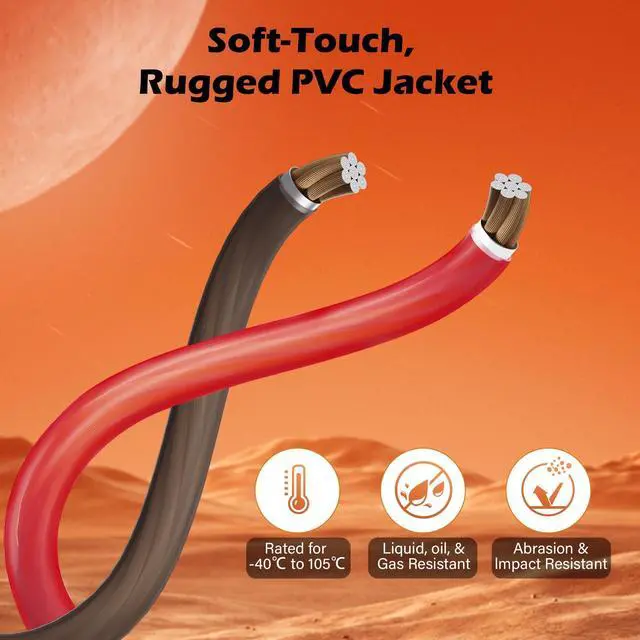 High Performance: The cable features high-quality soft PVC; the internal conductor is composed of high-strand copper-clad aluminum (412 strands of 0.254 mm), offering excellent flexibility and ease of installation, easier to bend and route neatly, ideal for wiring in tight or complex spaces such as car cabins ----The outer layer uses soft PVC with excellent weather resistance, capable of withstanding extreme temperatures (-50 to +105), and resistant to oil, gasoline, solvents, liquids, abrasion, and impact ---- Suitable for continuous load current of approximately 6080 amps, with a maximum allowable instantaneous or protected current of 100120 amps ^^