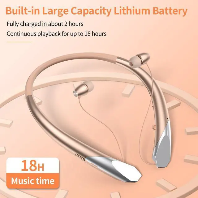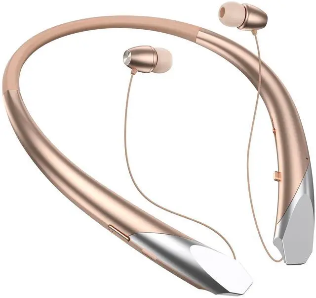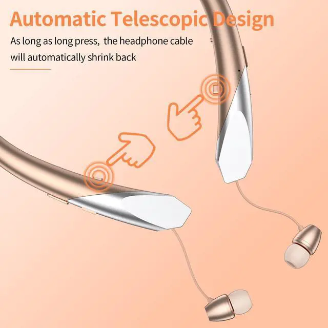 ^^ Ergonomic Neckband & Retractable Earbuds Ergonomic neckband design will make you can more comfortably to wear wireless headphones on the neck. The retractable ear bud design allows you to pull the retractable earbuds wire to the length you want and press the retract button can store the earbuds wire in Bluetooth