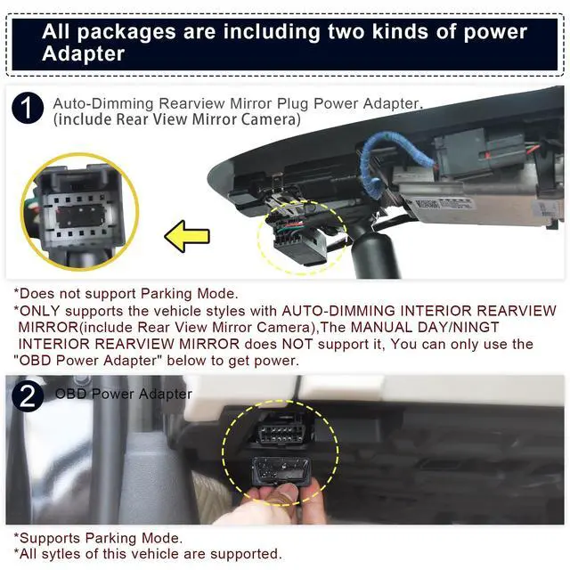 Please NoteYour car must have an Auto-Dimming Rearview Mirror Plug Power Adapter (10Pin square plug), otherwise, power can only be obtained through OBD or Fuse box. Parking monitor must have OBD Power Adapter or Fuse Box