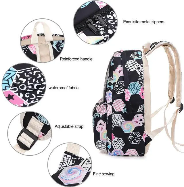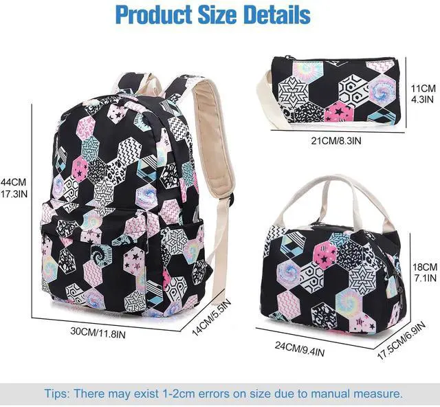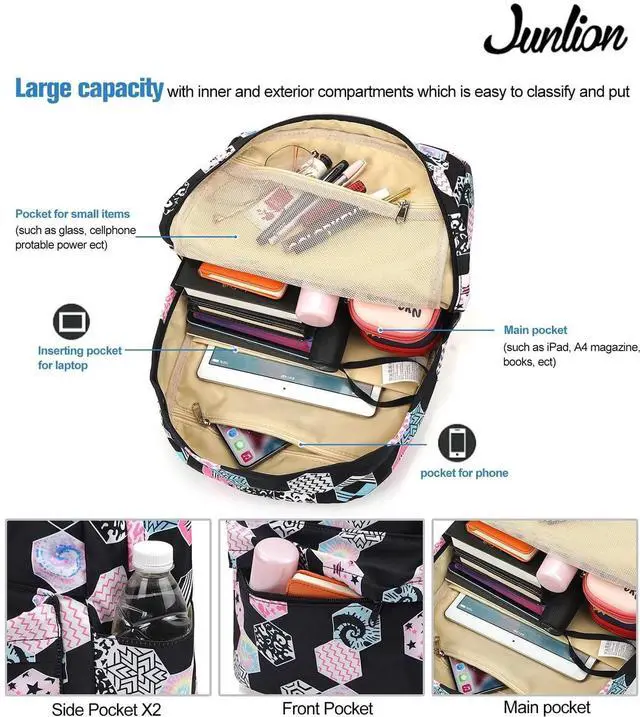 Junlion School Bag Set 3 in 1 ( Geometry Backpack + Lunch Bag + Pencil Case)Backpack Structure1* main compartment include 1* padded laptop compartment, 4* inside open pockets, 1* inside zipper pocket. The main compartment could fit notebooks, magazines, A4 files. The padded laptop compartment for 14 inch laptop. The inside open pockets for storing 2 pens, a mobile phone or small electronics. The inside zipper pocket for bank card and other valuables. 1* front zipper pocket, perfect for a briefcase or snack. 2* side pockets, can carry a water bottle and an umbrella.