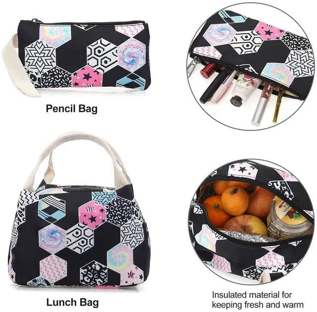Insulated lunch bag, available to put two lunch boxes and fruits inside. The small pencil case could put pens, keys, also can be used as clutch bag, a wallet or pencil kit.