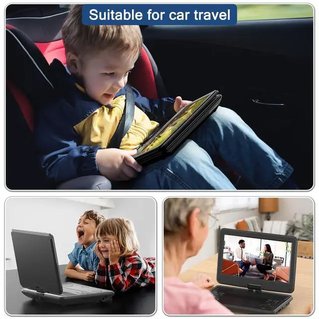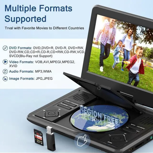 Protects the disc reading process for uninterrupted viewing. ^^ Companion for ChildrenSimple operation buttons and a large screen make this DVD player portable ideal for kids and the elderly. They can independently choose their favorite content and enjoy their own time when youre busy. ^^ Region-free and Multi-format SupportThe SQQBZZ portable DVD player with Screen is compatible with CD, DVD, CD-R/RW, DVDR/RW, VCD/SVCD (excluding Blu-ray and pirated discs), and supports USB and SD cards (up to 32GB) for VOB, AVI, MPEG, MP3, WMA, JPEG formats. ^^ High Volume SpeakersPortable DVD Player for kids equipped with dual stereo speakers offering adjustable volume levels to suit different age preferences.