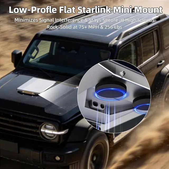 200lbs+ Heavy-Duty Magnetic HoldDesigned with 4 super-strong magnets and a reinforced steel plate, our Starlink Mini car mount supports up to more than 200lbs, ensuring your dish stays firmly in place even during highway driving, strong winds, or off-road travel. Enjoy reliable, uninterrupted internet wherever you go ^^ No Drill & Damage-Free InstallationInstall your Starlink Mini in secondsno tools, no drilling, no permanent modifications. Our Starlink Mini base gives full protection to your vehicles roof or any ferrous surface from scratches, dents, or paint damage ^^ Protective Case &