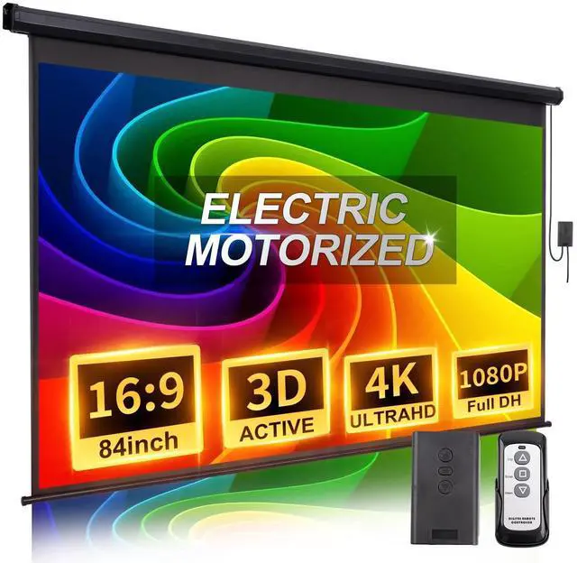 PROJECTOR SCREEN MOTORIZED: The 84 inch projector screen has a 16:9 aspect ratio. The screen features a high gain of 1.2 and is compatible with 3D, 1080P, 4K, and full HD images, ensuring excellent color reproduction. It offers an immersive virtual scene that makes you feel as though you're in a virtual world, providing a completely new experience for you and your friends. ^^
