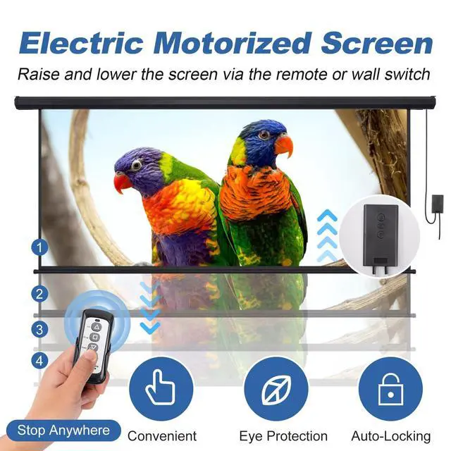 WIRELESS CONTROL & AUTO-LOCK: You can conveniently control the motorized projector screen's up and down movement from a distance using either wireless or wired control. This allows you to easily lock it at the desired length. The built-in motor is energy-efficient and operates smoothly and quietly, ensuring there is no lag during the ascent and descent of the automatic projector screen. Additionally, it has a long service life. ^^ 4