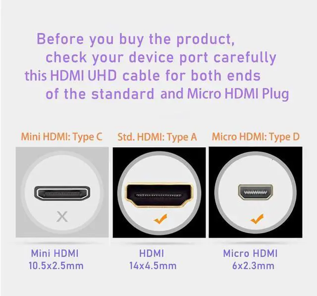 Notice: 1. The 4K HDMI Cable is Standard HDMI port, and Micro HDMI port; no Mini HDMI port, no Display port. 2. The downward weight of long cable at the plug end may damage plugs and sockets. 3. The transmission signal may be interfered with if a switching device is added between the lines and the equipment. 4. Observe the direction of the plug before installing the cable