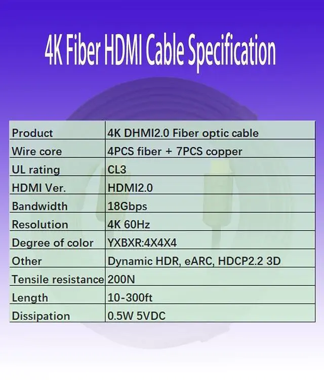 • 3.Ultra high speed 4K HDMI fiber optic cable supports 18Gbps transfer and is backwards compatible with earlier versions of HDMI cable (1.3/1.4
