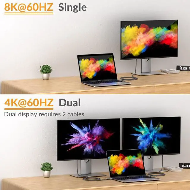 Display: This thunderbolt 4 cable can display video content to a single monitor in up to 8K@60Hz or to dual monitors in 4K. Please note that dual-monitor display requires two cables.