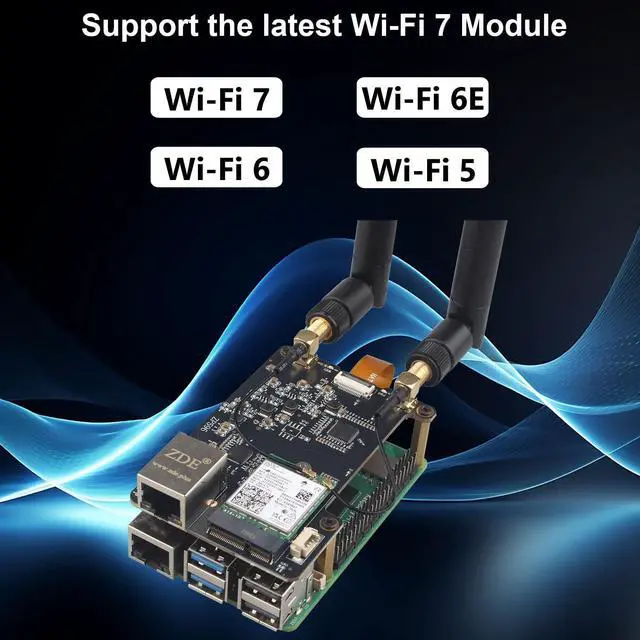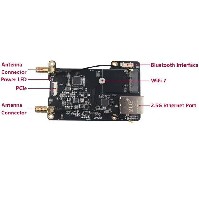 ^^ The ZP596 is an adapter board with PCIe interface for WiFi7/6/6E/5, allowing Raspberry Pi 5 motherboard to use the latest WIFI7 module. The WIFI7 module can be inserted into the ZP596 adapter board via the M. 2 E-KEY interface, which provides an opportunity for a wide range of Raspberry Pi 5 users to be able to use the latest WIFI7. ^^ At present, Ubuntu supports wireless network cards of WIFI7 WIFI6 (E) WIFI5, which can be used without installing drivers. The currently supported network cards include BE200, 8265C, AX200, AX210, MT7922.