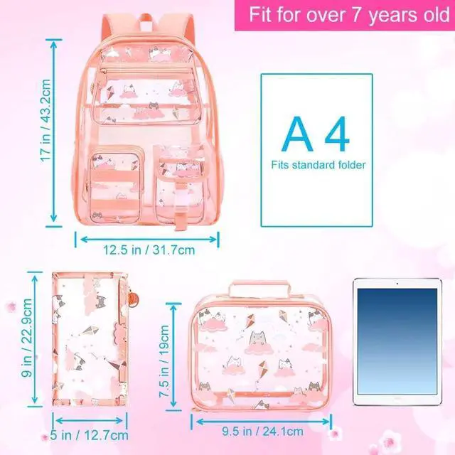 DescriptionClear Backpack for Girls, 17" Heavy Duty PVC See Through Bookbag, Cute Stadium Approved Transparent School Bags for Elementary Preschool - Dreamy Cloud Pink