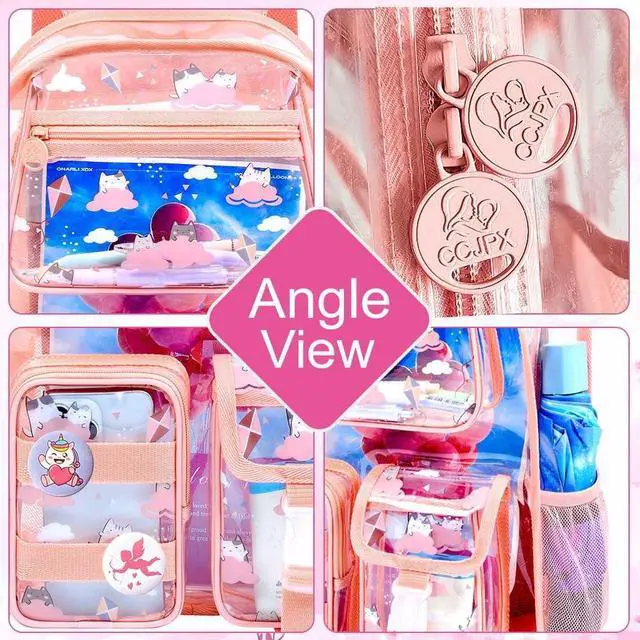 Whimsical Style, Dreamy Days: Imagine the joy with this delightful pink clear bookbag! It boasts a playful design featuring adorable cats frolicking among fluffy clouds, celebrating a unique and cheerful spirit. Let any personality shine with this transparent backpack and make every day extraordinary.
