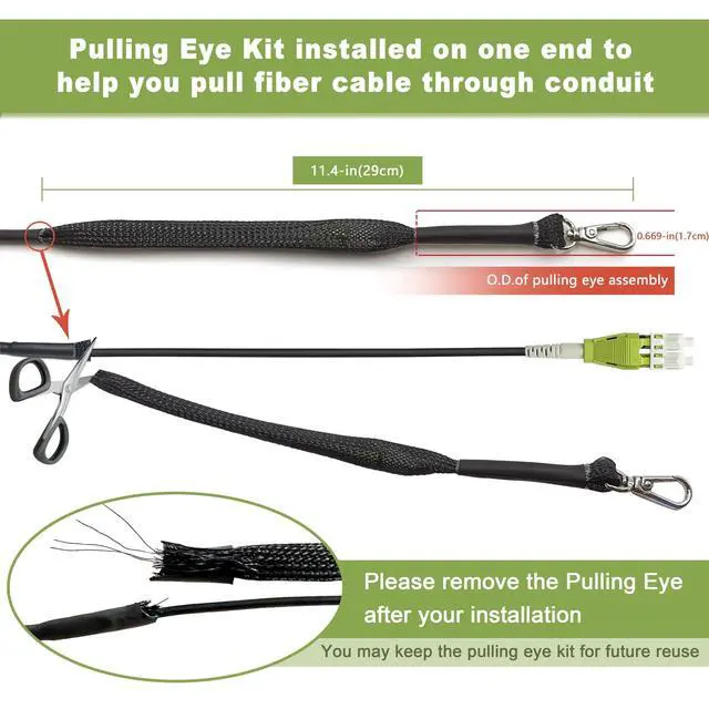 Pre-Terminated OM5 Patch Cables: with swivel pulling eye kit installed on one end to eliminate cable damage during installation. You can remove the pulling eye kit after installation and keep it for reuse. The pulling eye kit is a must for any riser or plenum fiber