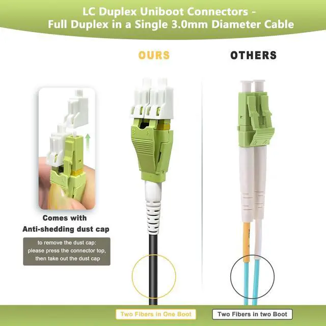 ^^ Cost-effective and Future-Proofing: Multimode OM5 LC Fiber Patch Cable with its support for SWDM and ability to accommodate emerging technologies and higher data rates. Investing in OM5 may provide better longevity for network infrastructure. ^^ Multimode OM5 Duplex LC Uniboot connector: The uniboot design allows one cable to carry two fibers to reduce the cable bulk when routing. LC Uniboot Connectors also enable simplified polarity correction in the field. No tool required