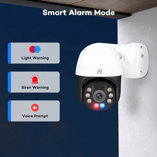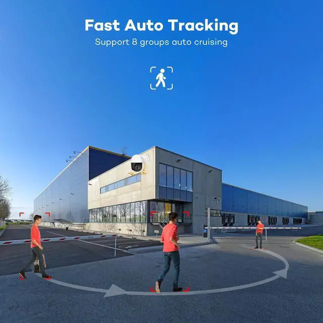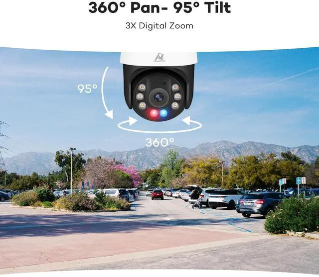 Pan Tilt Zoom-- 355 pan, 95 tilt, 3X digital zoom. ^^ 6 Million Pixels Super HD-- Delivering 3 times the clarity of 1080p for superior visual experience. ^^ Smart Human and Vehicle Detection-- Automatically detects humans and vehicles for enhanced security. ^^ Smart Human Tracking-- Capable of tracking human movements for continuous monitoring. ^^ Two-Way Audio-- Built-in microphone and speaker. ^^ Smart Color Night Vision-- AI detection activates 6 warm lights, outputting color night vision for clearer nighttime views. ^^ AI Detection Trigger Red and Blue Alarming Light-- Triggers alarming lights upon detection for immediate attention.