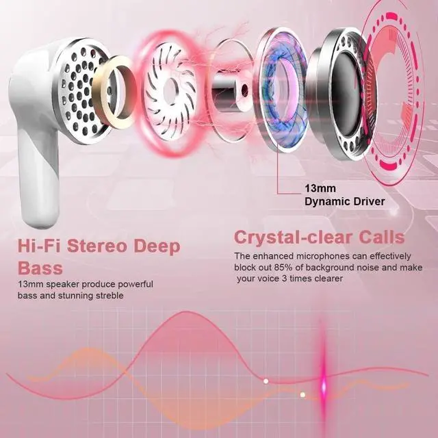 Clear Call: Wireless earphones adopt with DSR lossless HD rendering technology and equip with premium 13mm dynamic driver-the drive area is 4 times than the normal drive area, making the bass punchier and midrange full and textured, treble crystal crisp. Large chamber acoustic design well balances the internal and external air pressure to avoid sound loss, bluetooth earphones are combined ENC noise cancelling mic ensuring you can be heard clearly even in noisy environment. ^^ Ultralight and