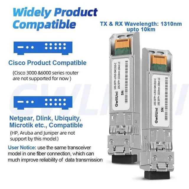High Performance Single mode duplex 10 Gigabit SFP+ transceiver, supports up to 10km fiber length connection and 0~70 operating temperature. ^^ Widely Compatible The SFP+ transceiver are widely compatible with Cisco products(Cisco 3000 &6000 series router are not supported) and Netgear, MikroTik, Ubiquity, DLink etc., ( Not recommended for HP, Juniper and Aruba products). The fiber module also works well with switch, router, media converter and more 10G SFP+ optic ports ^^ High Quality The shell adopts high density and heat-resistant insulation zinc alloy, high performance chipset, which makes the product more stable and efficient transmission, and low power consumption.