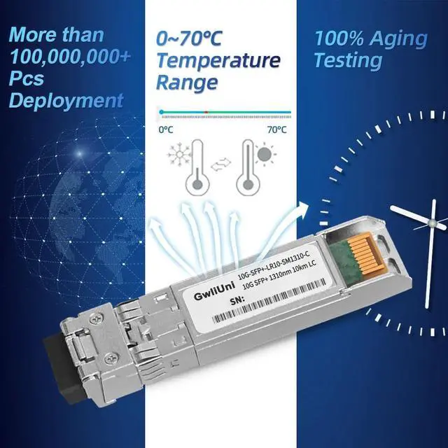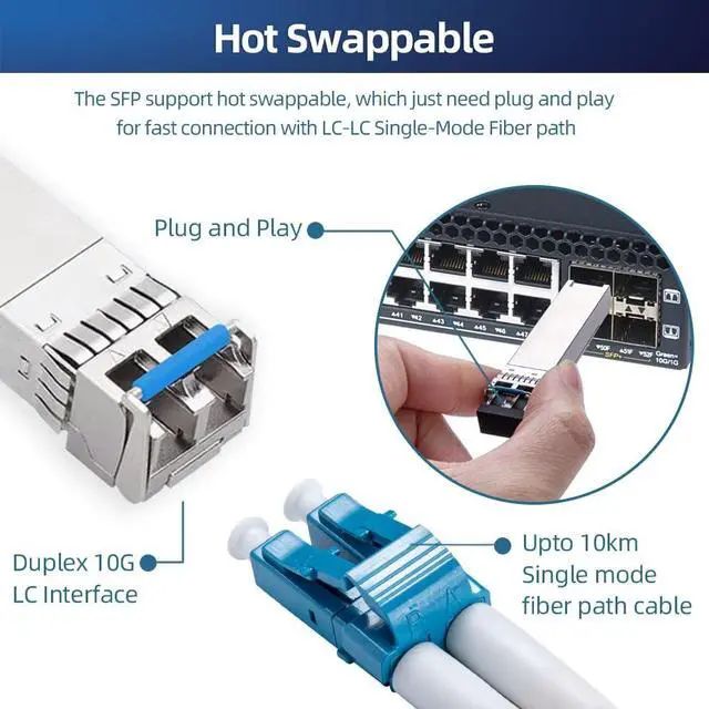 More than 1000k+ pcs SFP are already deploy in global market ^^ 100% Aging TestingThe gold finger of SFP+ module are carefully examined to reach the perfect combination of circuit assembly precision. All SFP are 100% aging testing after assembling to ensure that all sold modules are stable and high reliability ^^ Fast & Convenient Connection The SFP+ module support hot swappable, which just need plug and play for fast connection with LC-LC Single-mode fiber path.
