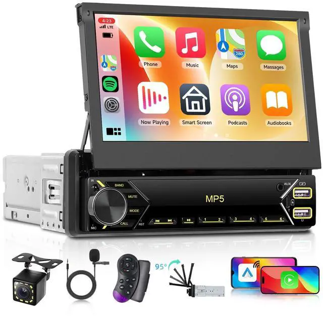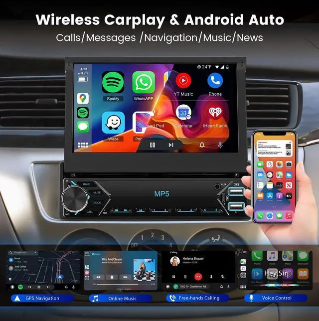 Media Compatibility: 7-inch touch screen single din retractable car stereo with wireless/wired CarPlay and Android Auto for seamless smartphone integration. Supports U disk, USB input, and Type-C for versatile media options. You-Tube video playback is available, and the screen is retractable when not in use, keeping your dashboard tidy. ^^ Enhanced Audio and