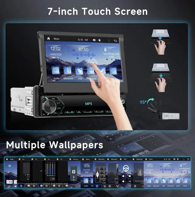 Visual Experience: Enjoy high-quality audio with built-in EQ settings to customize your sound. The 7 inch retractable screen car radio supports color backlight adjustment, adding a personalized touch to your driving experience. Same video technology enables simultaneous video output and device display, ensuring you never miss a beat. Multiple wallpapers allow you to personalize your screen according to your mood.
