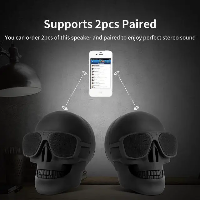 [ UNIQUE-DESIGN ] Skull shape designed, this wireless skull speaker is carrying powerful stereo speaker, you can either use this for home decoration or marvelous party time, you can listen to audio books in the bedroom at night, or play music while cooking, this product will go everywhere with you. ^^ [ BLUETOOTH CONNECTION ] The bluetooth 5.0 technology. This skull bluetooth speaker can easy connect to cellphone or the bluetooth enabled devices. ^^ [ SUPPORTS WIRELESS PAIRING ] This speaker supports 2pcs wireless pairing. You can pair 2pcs speakers with one device to enjoy huge stereo sound.