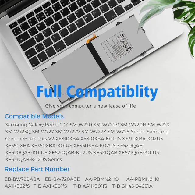 Part Number: EB-BW720ABA EB-BW720ABE BA43-00390A GH43-04691A AA-PBMN2HO AA-PBMN2H0AA1KB22fS/T-B AA1K801fS/T-B AA1KB01fS/T-B 2ICP4/81/111Compatible with Laptop Model (use "Ctrl+F" to find your model quickly): Samsung ChromeBook Plus V2 XE520QAB Series: XE520QAB-K01US XE520QAB-K02US XE520QAB-K03US XE520QAB-K04US. Samsung ChromeBook Plus V2 XE521QAB Series: XE525QBB XE521QAB-K01US XE521QAB-K02US XE521QAB-K03US. Samsung Chromebook 4 Chrome OS 11.6"